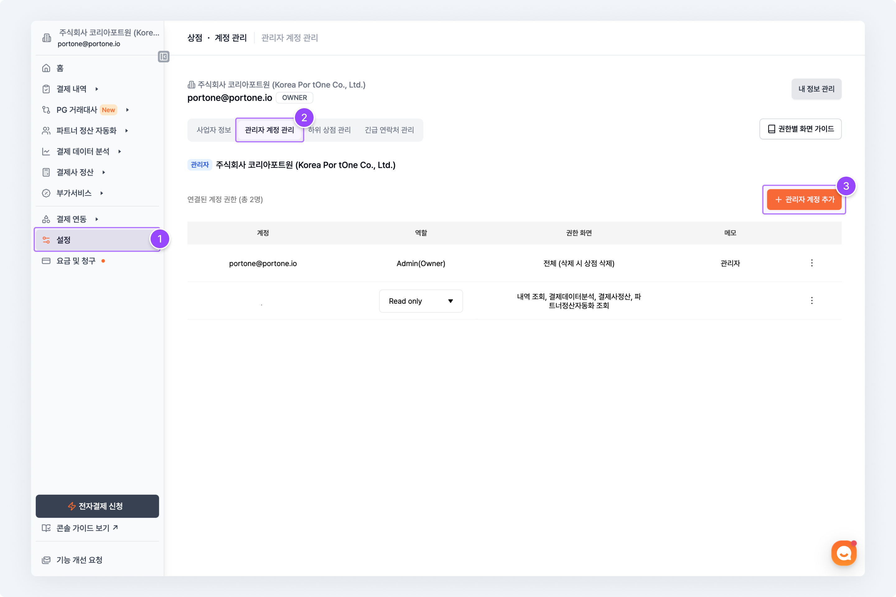 포트원 관리자콘솔의 계정의 권한별 생성가능한 경로 및 갯수를 안내드립니다.