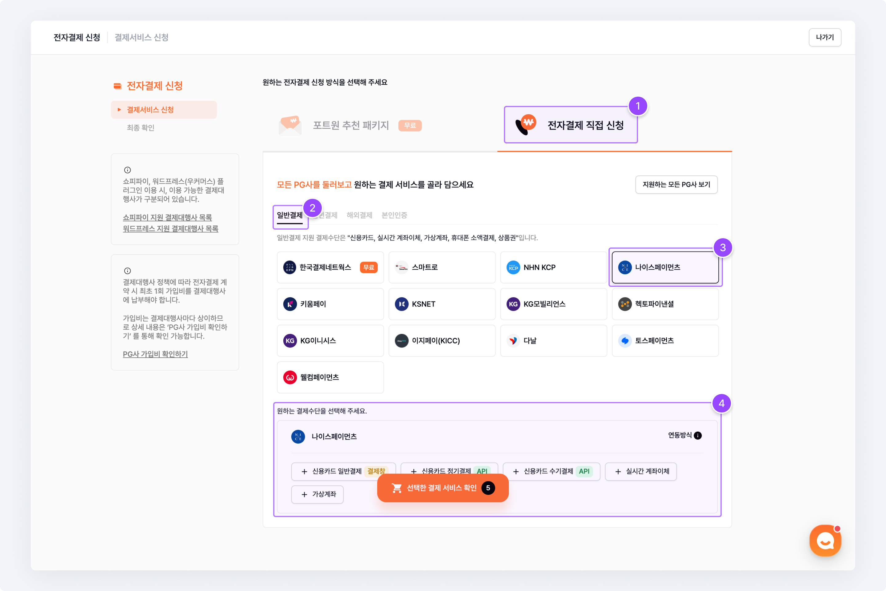 - 경로 : 포트원 관리자콘솔↗ 회원가입 및 로그인 > 좌측 상단 [전자결제 신청] 버튼 클릭 > 사업자등록증 업로드 > 원하는 결제수단 & 결제대행사 선택 후 제출