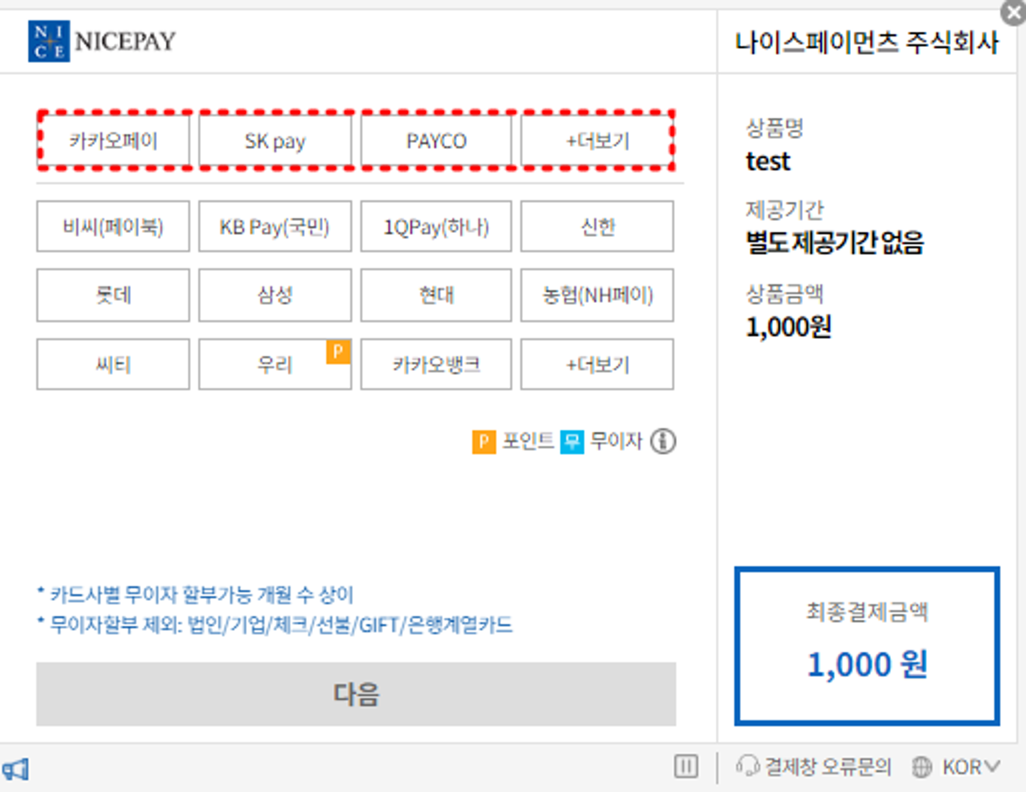 1. 나이스정보통신 결제창 내 간편결제 서비스 이용
