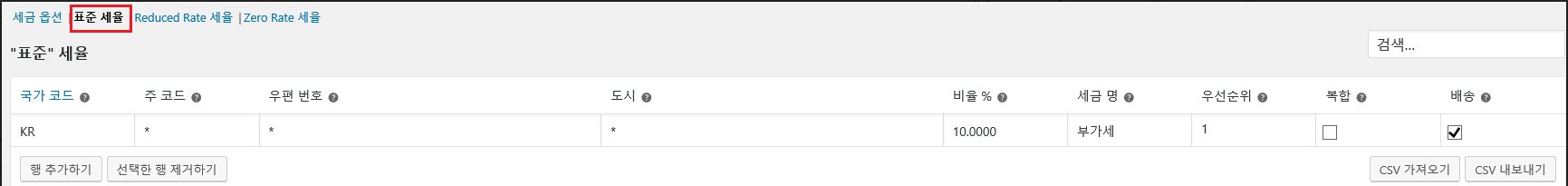 1) 우커머스 > 설정 > 일반 메뉴에서 "세금 활성화" 체크 후 저장 2) 우커머스 > 세금 > 표준 세율 설정
